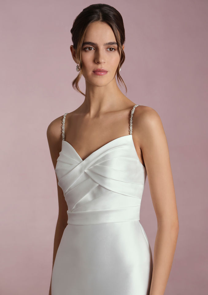 FUMIKO's exquisite simplicity is complemented by the delicate pleated details that adorn the bodice. Crafted entirely in mikado, a fabric that gives it body and structure, it also includes delicate rhinestone straps and a completely smooth skirt that perfectly represents the well-known maxim of "less is more".