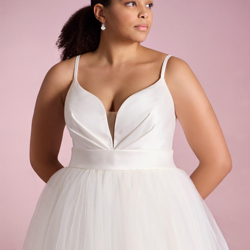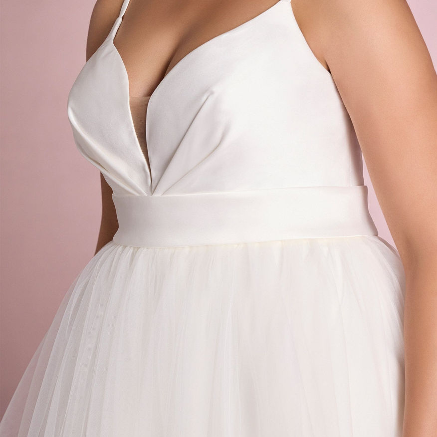 The SUMIKO model combines the charm and elegance of two of the great bridal fabrics par excellence. The bodice is made of mikado and features a plunging sweetheart neckline, pleated trims and a sash-like detail at the waist from which a princess skirt made of a wonderful tulle fabric falls to add charm and volume.